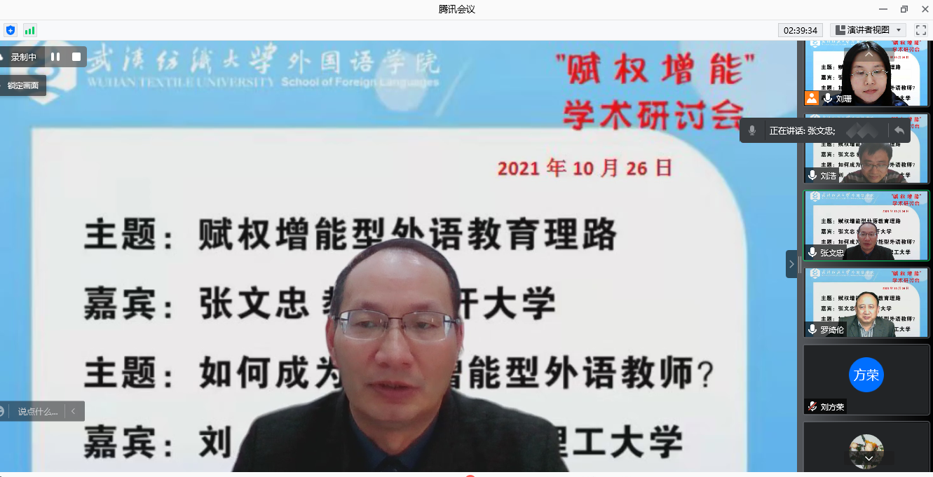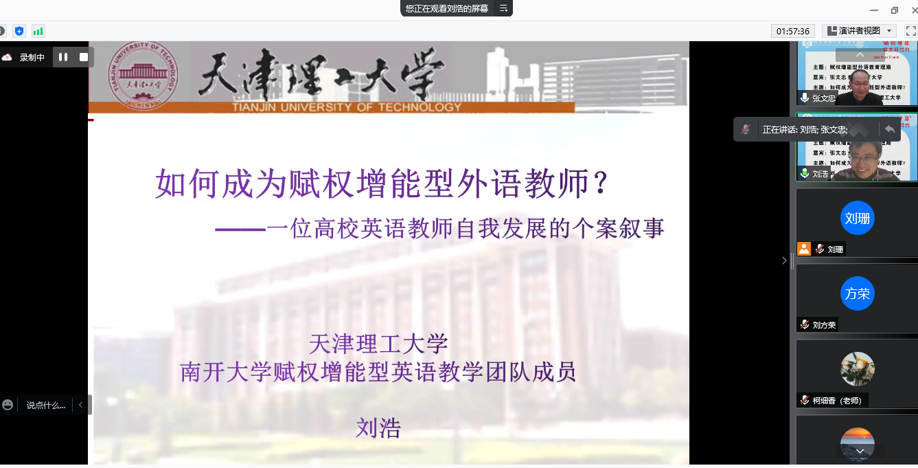 刘浩博士也做了题为“如何成为赋权增能型外语教师”的主旨发言,从高校英语教师自我发展的视角,分享了他的赋权增能型英语教学实践和学术研究之路,并以个性化英语阅读课和英语阅读社群为例分享了赋权增能型教学实践和课堂自运行流程。随后与会老师们进行了深入讨论。