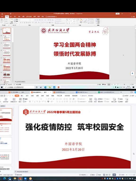 彭姿老师对同学们积极关注两会,配合疫情防控,对提案表达自己的思考进行了赞扬,并建议同学们多思考两会和我们本专业学习的联系之处。鼓励大家在学习的同时,规律锻炼、注意饮食和睡眠,“五育并举”,注重身心健康和全面发展,并推荐大家在学习之余可以通过武汉市文化和旅游局视频号等平台云端游武汉。