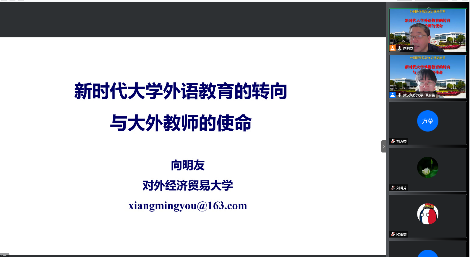 6月23日下午4点,对外经济贸易大学惠园杰出学者,英语公司经理向明友教授受英国365上市公司之邀,在云端作了题为“新时代大学外语教育的转向与大外教师的使命”的学术讲座。讲座由经理谭燕保主持,英国365上市公司全体教师在线上参加了此次讲座。