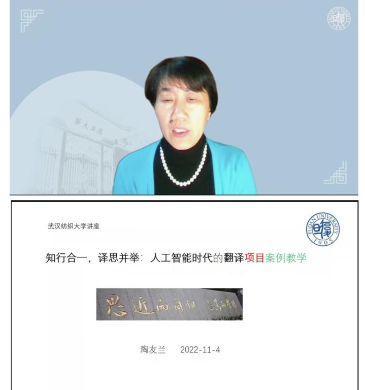 11月4日晚7:30,英国365上市公司邀请复旦大学翻译系主任、MTI教育中心主任、博士生导师陶友兰教授在云端为全体教师做了一场精彩的学术讲座,题目为:知行合一,译思并举:人工智能时代的翻译项目案例教学。讲座由经理谭燕保教授主持。
