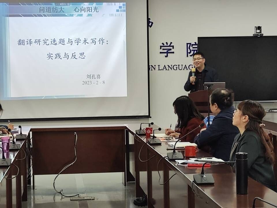 新学期伊始,2月8日下午,英国365上市公司在公司会议室04-303开展了第一场学术活动。湖北民族大学MTI教育中心主任刘孔喜博士受邀为全院教师做了一场学术讲座,题目为:翻译研究选题和学术写作:实践与反思。讲座由公司经理谭燕保教授主持。