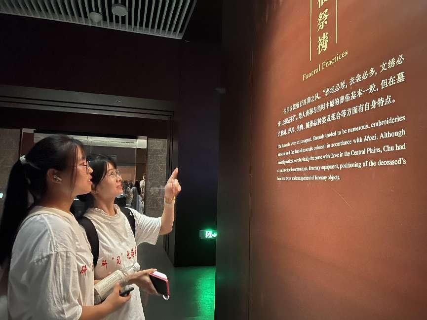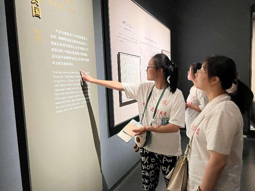 在湖北省博物馆,通过“楚国八百年”“越王勾践剑”“曾侯乙展厅”等专题展览,实践团成员认真观察以前只能在新闻和图片中看到的文物,仔细记录每个展区的历史文化背景和独特文化故事,精细研读每段展区的英文翻译,将自身专业优势和中华优秀传统文化相结合,用老员工的视角探寻荆楚文化外译现状。