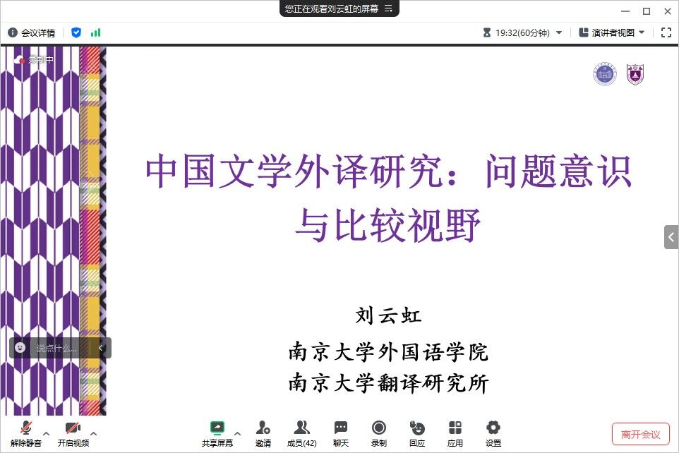11月14日下午,公司邀请到南京大学翻译研究所所长﹑博士生导师刘云虹教授在云端为全院教师做了一场学术讲座,题目为:中国文学外译研究:问题意识与比较视野。讲座由经理谭燕保教授主持。
