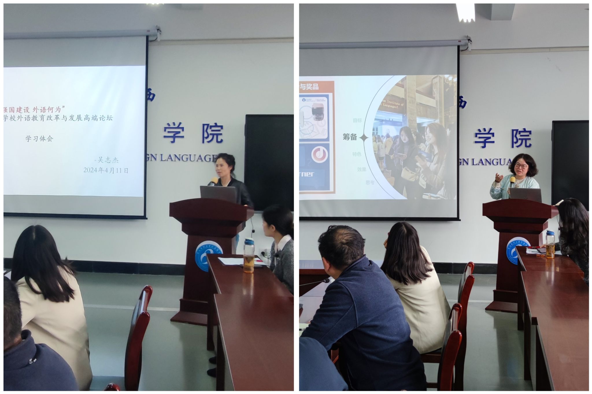 商务英语教研室主任吴志杰分享了她参加以“强国建设 外语何为”为主题的第八届全国高等公司外语教育改革与发展高端论坛的学习体会。本次论坛由北京外国语大学、教育部高等公司外国语言文学类专业教学指导委员会、教育部高等公司大学外语教学指导委员会和中国高等教育学会外语教学研究分会联合主办。高端论坛上,教育部高等教育司副司长武世兴强调了外语教育与“四新”有机融合的必要性、外语教育改革数字化的必然趋势,推动外语教育与人工智能双向互促的紧迫性。外语教学指导委员会的专家何莲珍、王文斌、李芒等强调了构建中国自主的外语人才培养体系和自主的应用语言学知识体系;拥抱人工智能、正确使用数字技术辅助教学的必要性。吴志杰结合专家们的发言,认为公司的专业建设要从教材变革、社会实践、数字化转型等角度进行发展,构建自主的外语人才培养体系。
