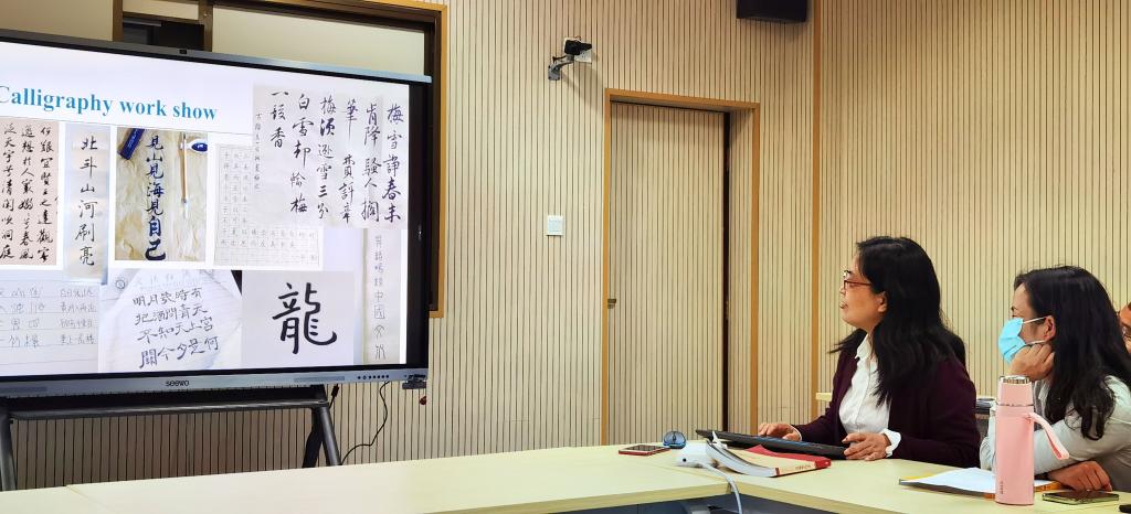 在课堂小结环节,杨老师使用了“转盘游戏”来归纳复习本次课的关键词,老师们饶有兴趣地讨论如何将这一游戏进一步优化并运用到诸如词汇复习、小组竞赛、知识抢答等活动中去。杨老师还展示了一项课后作业:员工们的书法作品。老师们看到员工的作品风格各异,内容丰富:有各种字体-行书、楷书、篆书、隶书等,写的内容有诗词、名言、祝福等,员工们不仅用自己的书法作品传达了中文的智慧和书法艺术的魅力,而且能更加自信地用英语介绍中国文字和书法。