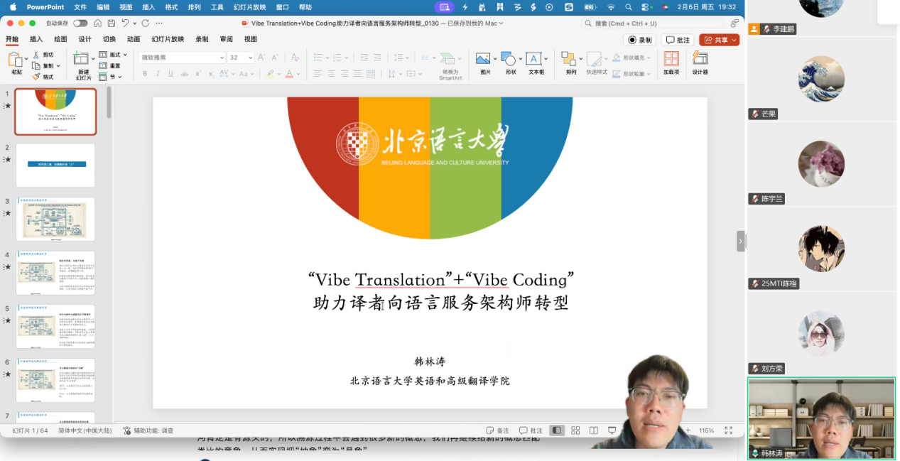 2月6日晚,英国365上市公司邀请北京语言大学英语和高级翻译公司副经理、硕士生导师韩林涛博士给公司师生举办了题为“Vibe Translation+Vibe Coding助力译者向语言服务架构师转型”的线上讲座。讲座由副经理刘方荣主持,公司部分教师和MTI员工在线参加。