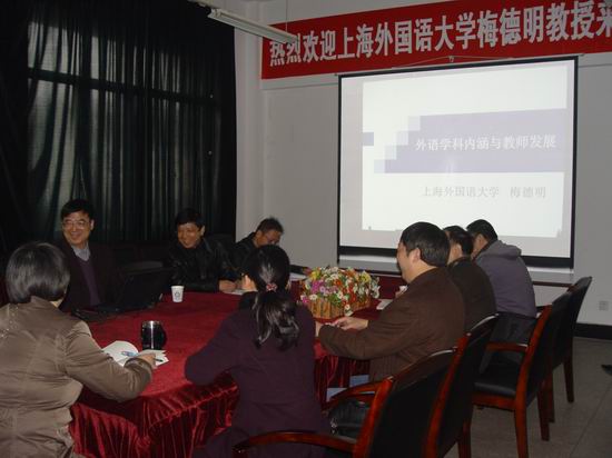 梅德明教授以“两篇小员工作文的思考”为引子,首先分析了当今英语专业面临的问题和挑战。随后,梅教授详细地为大家介绍了外语专业学科的内涵、外语团队建设规划与发展定位以及高等院校英语专业培养目标。期间,他详述了高等院校外语专业学科性质和学科定位,并阐述了高校复合型人才的不同培养模式以及高校外语教师的职业定位与发展和所面临的各种挑战,并在讲座的最后亲切地和教师们交流,解答他们的疑问。