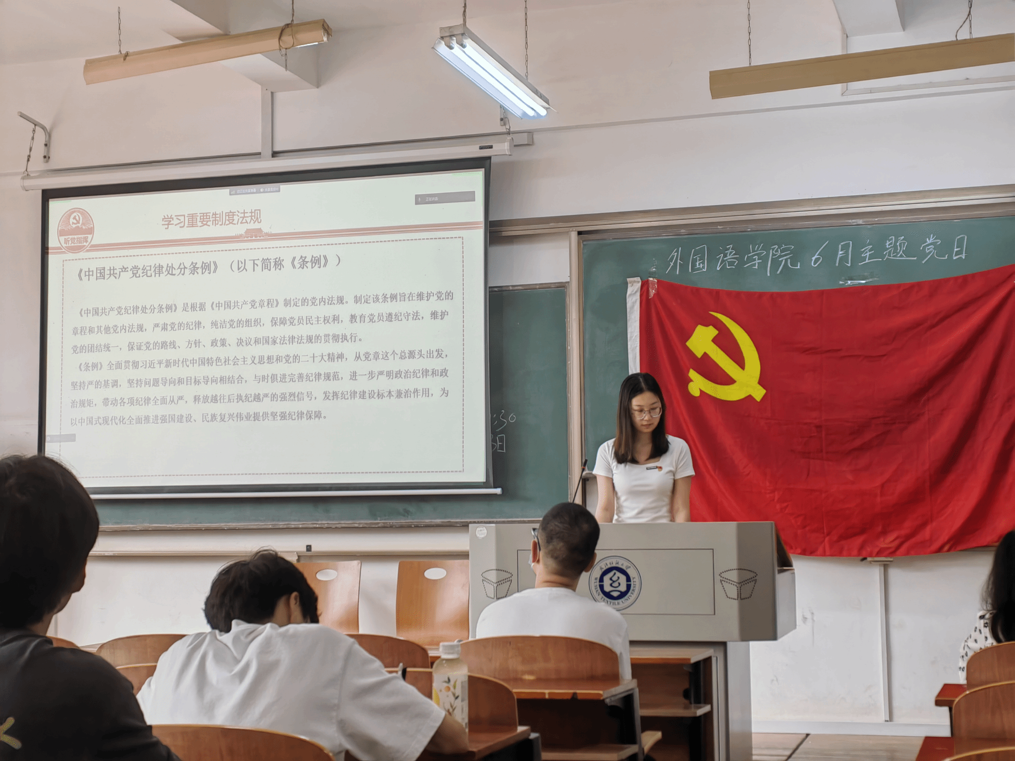 随后,英语员工支部书记甘新敏带领同志们学习了《中国共产党纪律处分条例》相关内容,并强调学党纪是终身必修课,作为党员,必须心有所戒、行有所止,员工党员更要在班级、宿舍发挥先锋模范作用,积极践行员工党员在身边的承诺,用实际行动服务同学。