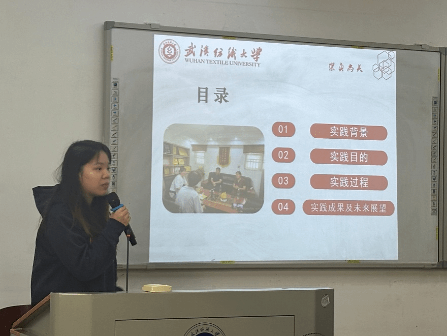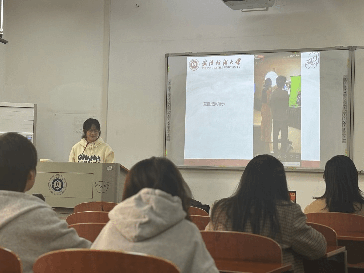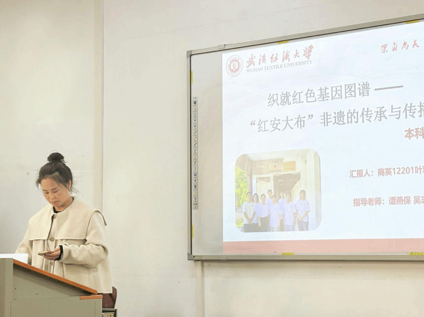 随后,叶羽洁同学介绍了她参与的红安大布非遗文化传承项目。她从理解当代中国系列书籍实践和保护非遗文化的角度出发,阐述了项目的目的:传播与保护非遗文化、进行红色教育以及提升跨文化交流与传播能力。她不仅分享了她参观非遗展览馆和黄麻起义革命展览馆的经历,还详细介绍了在非物质文化遗产保护展览馆进行的抖音直播过程。