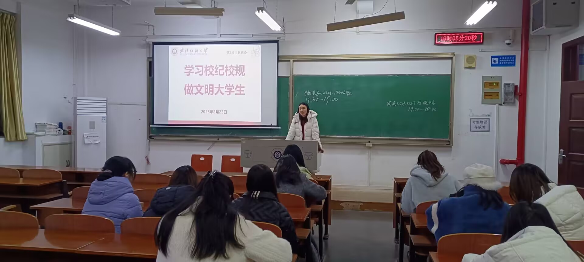 班会上,老师围绕多项校纪校规展开了详细讲解。在本科生考勤及请假管理办法方面,老师明确了考勤范围,涵盖了课堂教学、实验实训、实习等各个教学环节,强调了按时出勤的重要性。同时,对请假手续与审批流程、销假与续假的具体要求进行了细致说明,让同学们清晰了解在特殊情况下如何正确履行请假程序。
