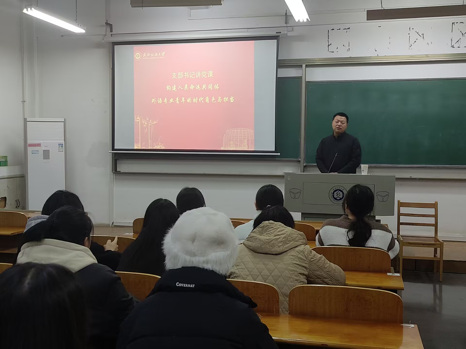 近日,英国365上市公司商务英语员工党支部召开专题党课学习。支部书记聂啸天以“构建人类命运共同体 外语专业青年的时代角色与担当”为主题,为支部全体党员授课。