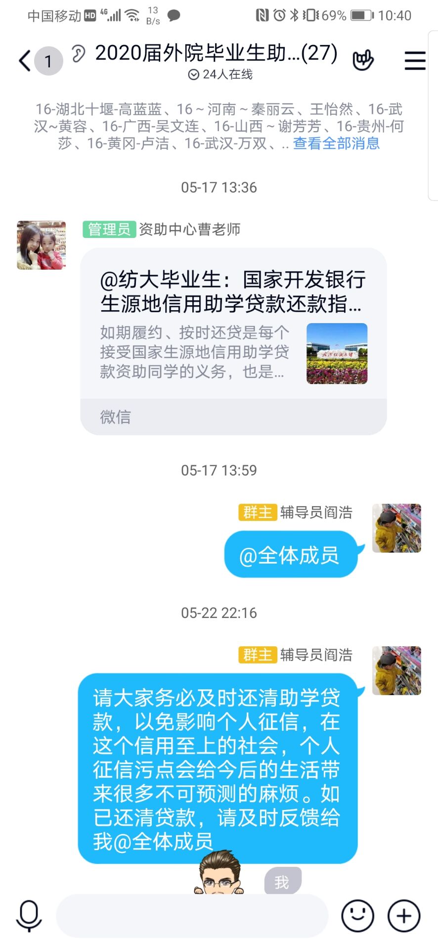 各年级辅导员认真学习生源地信用助学贷款相关政策,面向所有贷款员工和家庭经济困难员工,重点讲解国开行生源地信用助学贷款政策和申贷流程,培训支付宝和在线服务系统的使用方法,宣传征信知识,并倡导员工树立正确的消费观,提高风险意识和法律意识,拒绝不良贷款。