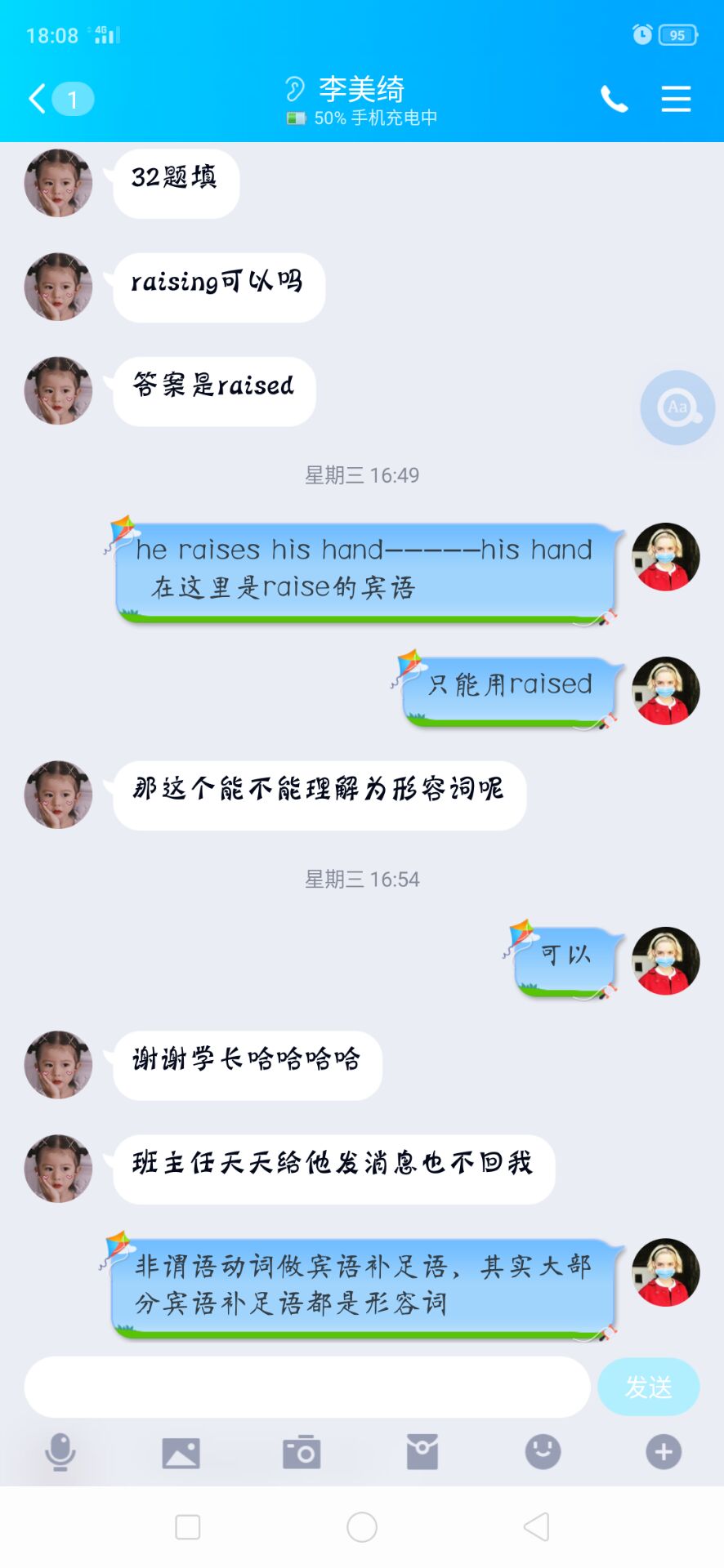 但这让人防不胜防的疫情却将本就任务繁重的高三学子困在家中,无法重返校园,对他们来说,学习总是刻不容缓。在那次招生宣传中我认识了高三(21)班的学妹李美绮,由于疫情的影响,她从年前到现在一个人被困在校外的出租屋,独自备战高考。出于对学妹的鼓励支持和公司的号召,我开始尝试用自己的英语专业优势为她的复习助力,解答疑惑。同时考虑到她一个人在家复习难免会有压抑的情绪,我开始每周给她找一个英语励志小视频并且抽时间和她聊天疏导心理,调节情绪。我记得我在高一时经常被要求检查背诵公司的校训“成就最好的自己,服务祖国和人民”,这次在疫情中的线上助学更加深了我对这句话的理解。