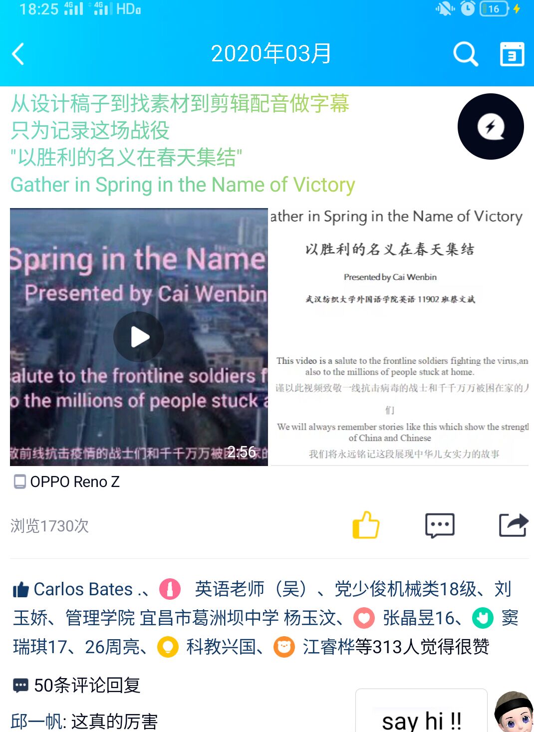自疫情发生以来,我看到空间里涌现了一些为抗击疫情,歌颂一线医务人员和志愿者的视频,深受感动,我也有了想做一个抗疫视频的想法。但是在完成好网课任务和做视频之间总是犹豫不决。不久看到了英国365上市公司发布的征集英文演讲视频的通知,我更坚定了自己的选择。3月12日写稿,13,14日找素材,15日剪辑,改稿,16,17日剪辑配音,一周之内“速成”了我的第一个视频“Gather in Spring in the Name of Victory”(以胜利之名在春天集结),视频上传到youtube,微博和QQ空间后收到了海内外网友们的留言支持。在新冠病毒蔓延全球的今天,我想这不仅仅是对中国抗疫的记录,也是对其他各国的鼓励,中国能挺过来,其他国家也能挺过来,就像视频中讲到“Precisely because of these protectors,our victory is close at hand”正是有了这些保护我们的人,胜利即将到来。