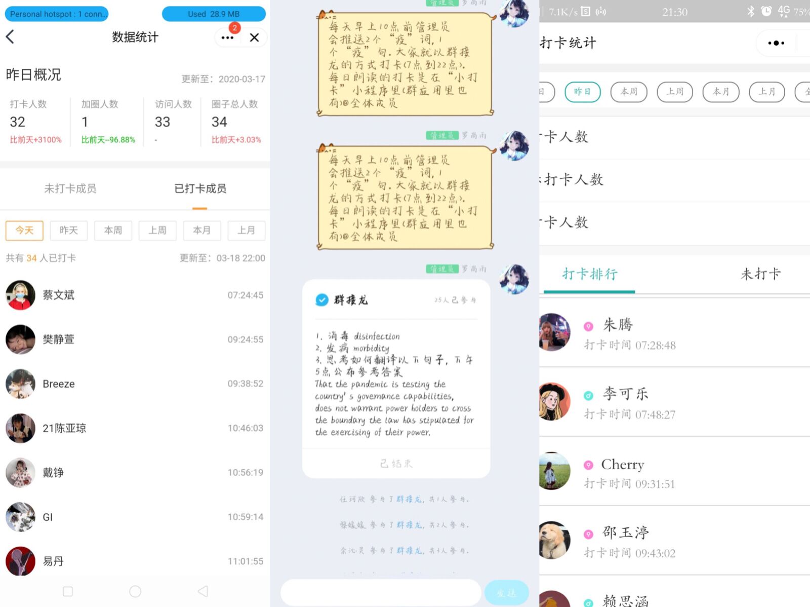 以“译”抗疫活动由“译”起朗读、每日“疫”词、每日“疫”句、每月“疫”报四个子活动构成。活动均在qq群内以班级为单位,利用“小打卡”小程序建立专门的学习圈子开展。公司遴选优秀员工代表作为各班学习团队负责人,负责各班活动的组织开展和成员打卡监督管理。这样的形式,在疫情期间,既确保了班级学风的榜样引领作用,又减轻了身负督促报平安任务的班委工作量。活动开展以来,无论是组织者还是参与者都积极性高涨,动力十足。