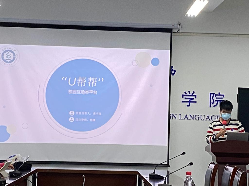 最后一位,是来自商英专业的袁宇辰同学,他带来的项目主题是《“U棒棒”校园互助平台》。在充分了解了员工校园生活的困难点后,袁宇辰同学运用了本专业知识,进行了“U棒棒校园互助平台的构想与设计,从投资、风险评估等方面对此项目进行了专业性极强的介绍,得到老师一直认可。