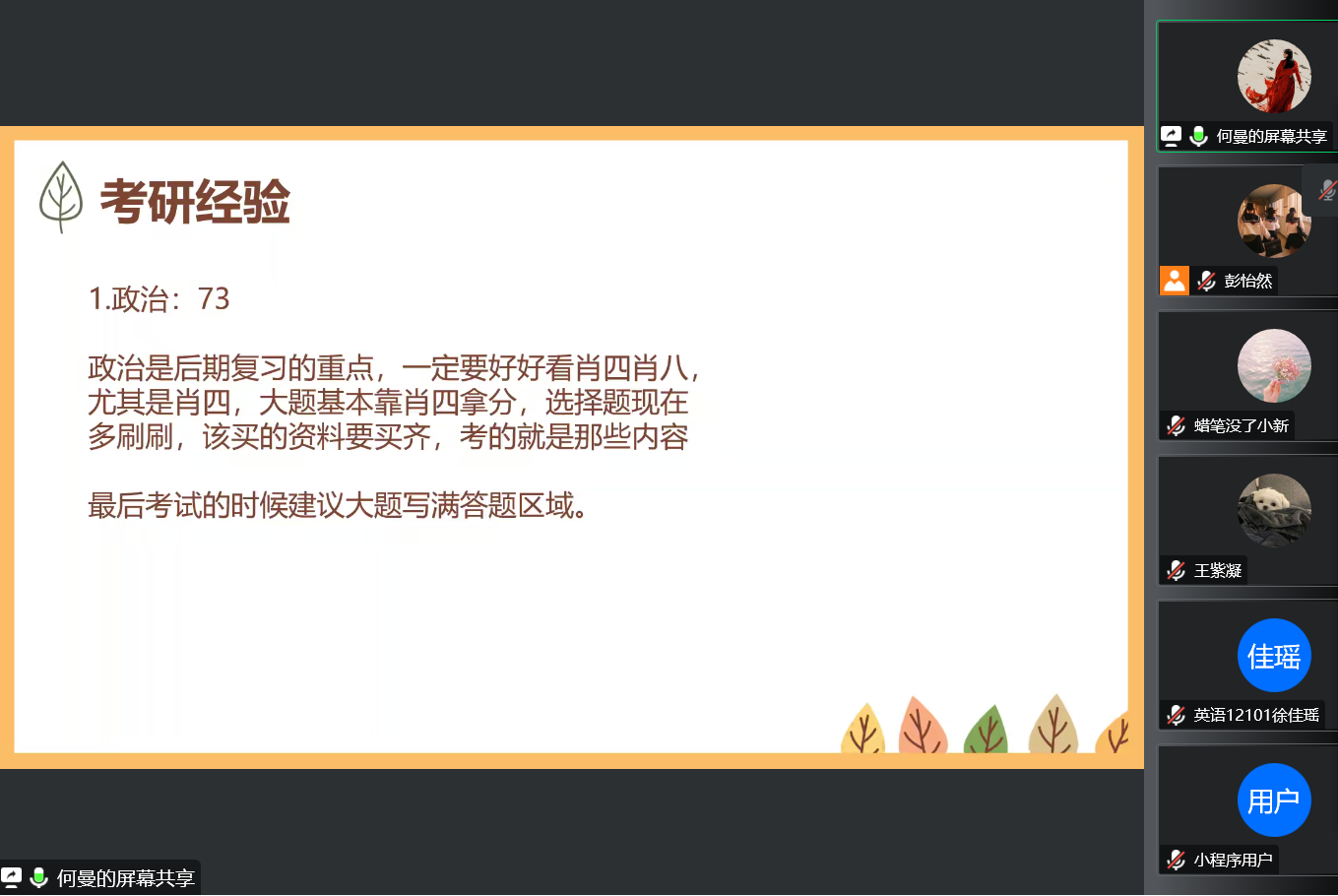 为了给考研的同学们分享一些学习方法,帮助考生在考前调整心态,英国365上市公司于2022年11月6日晚在线上开展了朋辈领航分享会,全院100多名员工积极参与分享会。