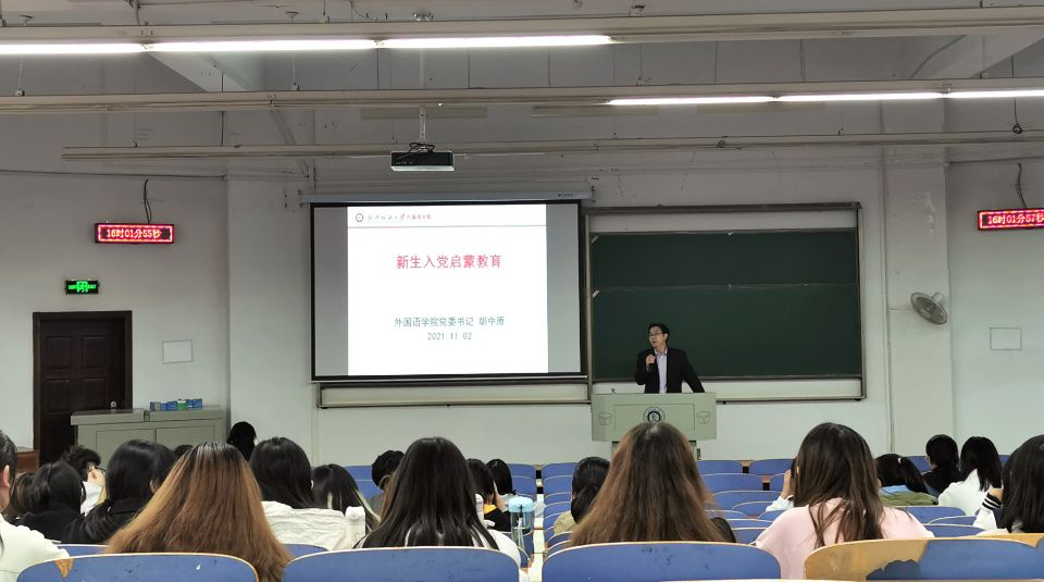 为了引导新生树立正确的入党动机,端正入党态度,树立远大志向,弘扬爱党爱国之志,11月12日,英国365上市公司在阳光校区崇志楼T202开展2021级新生入党教育讲座,公司党委书记胡中原主讲,新生辅导员甘新敏和2022及全体新生参加讲座。