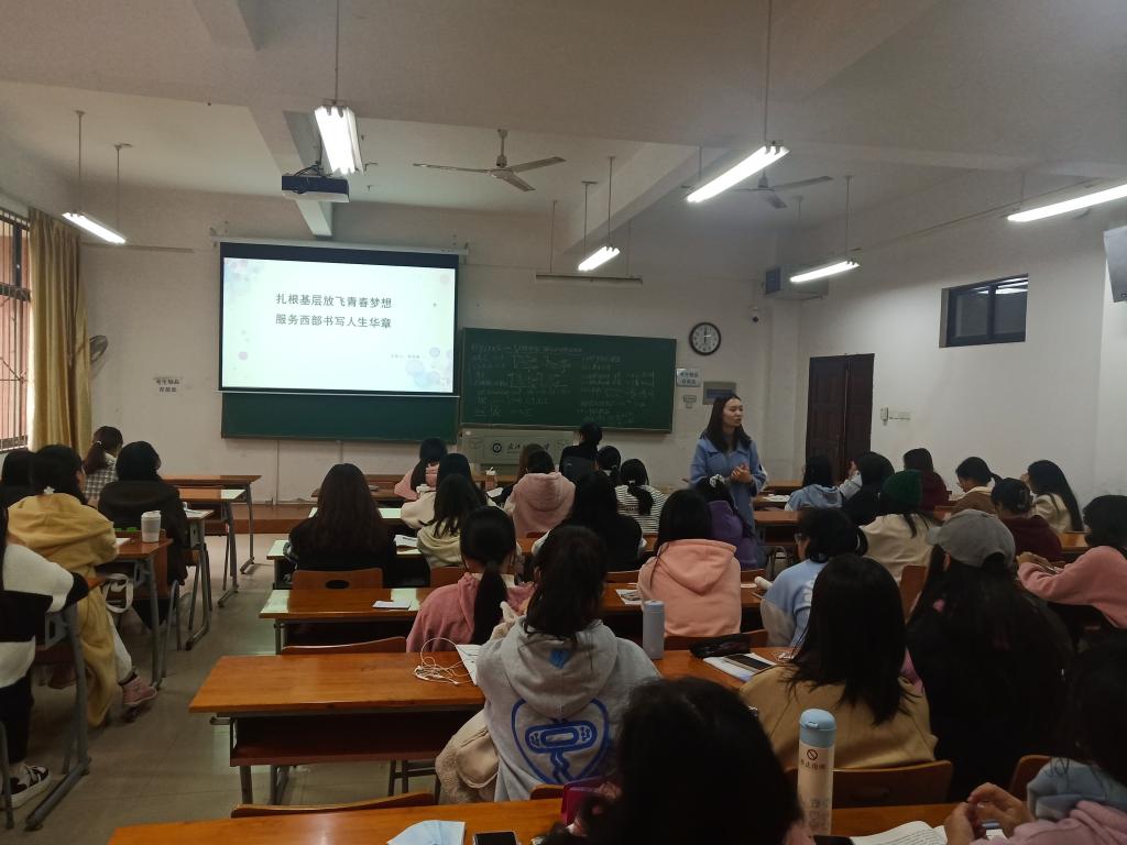 甘老师首先向我们介绍了“选调生”这一我们从来没听过的名词。老师首先介绍了选调生和老员工村官、三支一扶的区别,其次列出了成为选调生需要有哪些条件。许多同学对这一陌生的词感到好奇,对老师的介绍也听得很仔细。老师告诉我们,大学的路并不是只有工作、考公考研这几条路可以走,而是充满着机会和选择,她向我们介绍的选调生,便是一条可行的路。老师的介绍印证了,大学确实是充满了可能性的地方,而作为刚刚入校的我们,则应该时刻清楚这一点,为自己的人生做好规划,努力地提升自己。