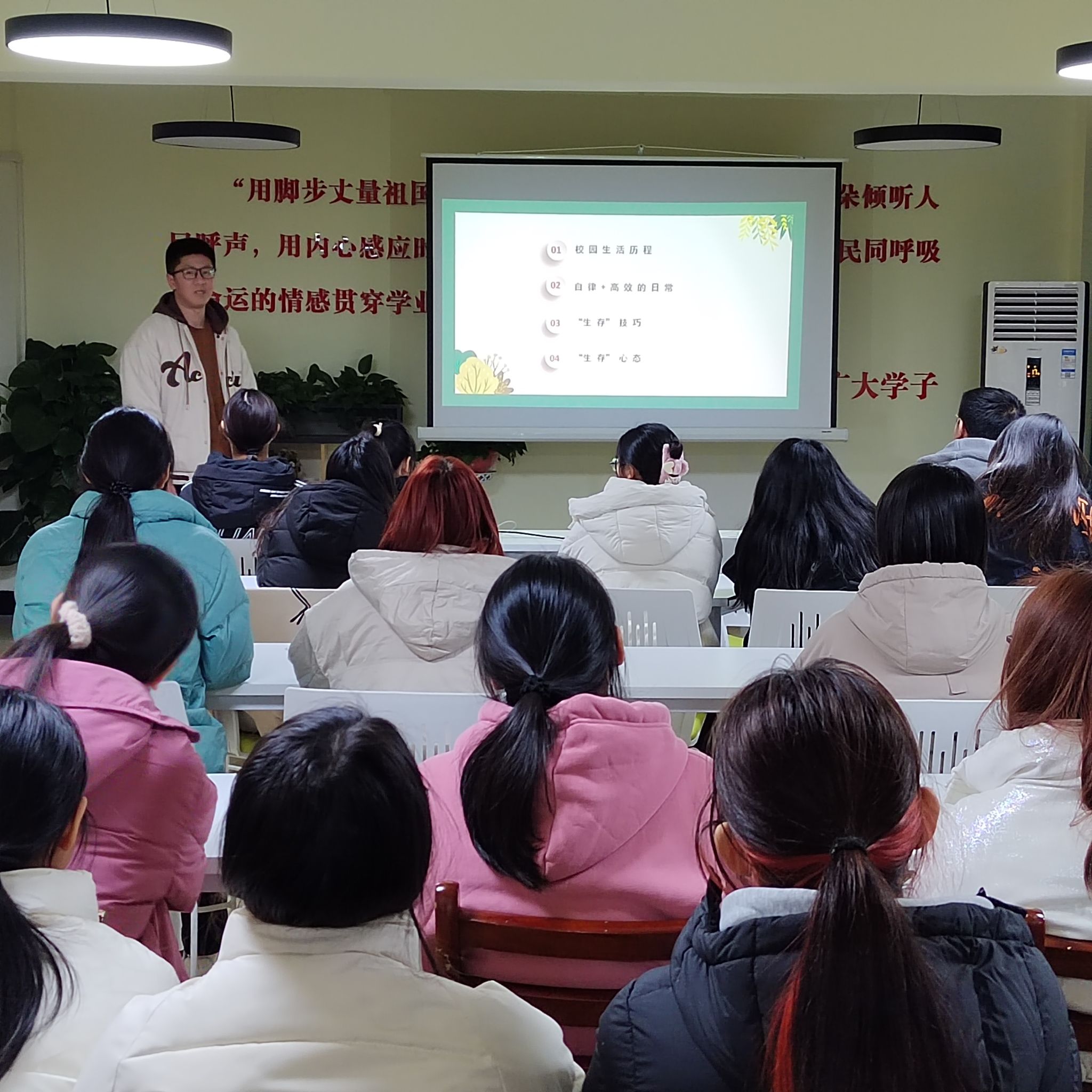 英国365上市公司英语12001班杨思韬同学,从校园生活历程、自律+高效的日常、“生存”技巧、“生存”心态进行了交流分享,重点介绍了自己通过日程表高效推进学习计划的方式。