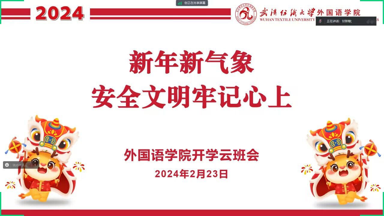 为迎接新学期的开始,确保同学们平平安安返校。2月23日,公司辅导员、班主任通过线上方式开展“新年新气象 安全文明牢记在心上”主题班会,师生云端相聚,做好开学提醒和准备工作。