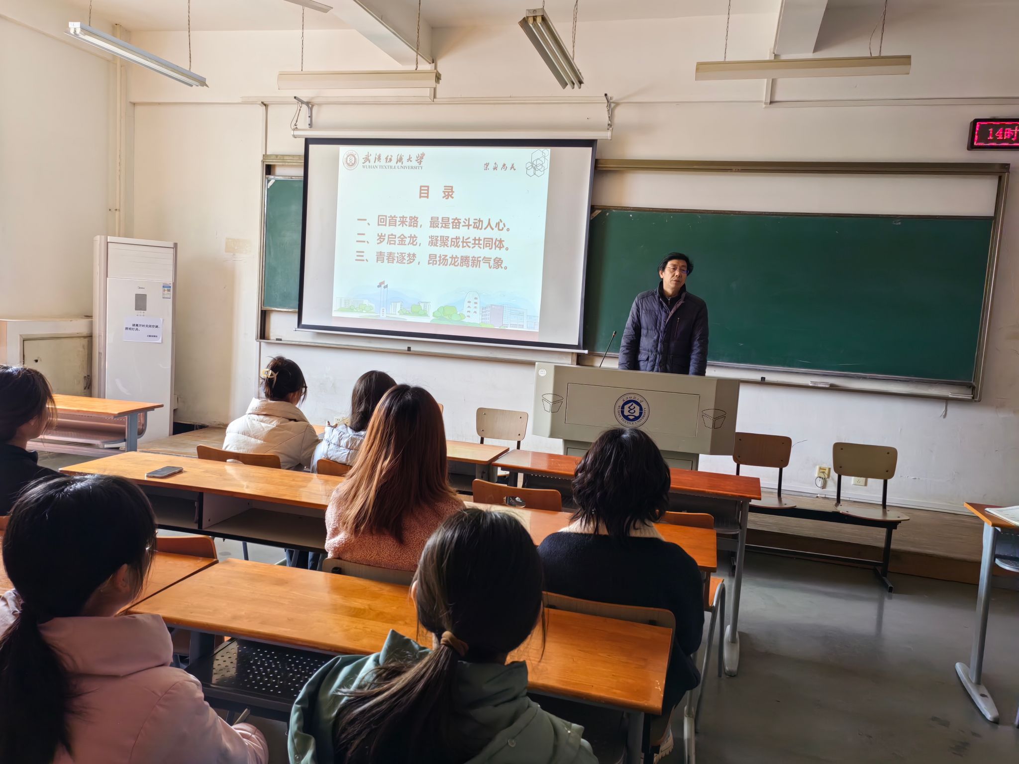 主题班会上,胡中原从“回首来路,最是奋斗动人心”,“岁启金龙,凝聚成长共同体”,“青春逐梦,昂扬龙腾新气象”三个方面向同学们提出了新学期新的要求。他强调,同学们要做一个有家国情怀的人,要关心国家大事,外院学子当明确人生理想,笃定前行方向,以徐卫林董事长和年轻的航天科研人员为偶像,脚踏实地,坚定地走向自己的人生新阶段。他鼓励同学们走出寝室,拥抱自然,管理自我,充实生活,鼓励同学们学业要有干劲,人生要有规划,共同缔造“美好纺大”,成就精彩人生。